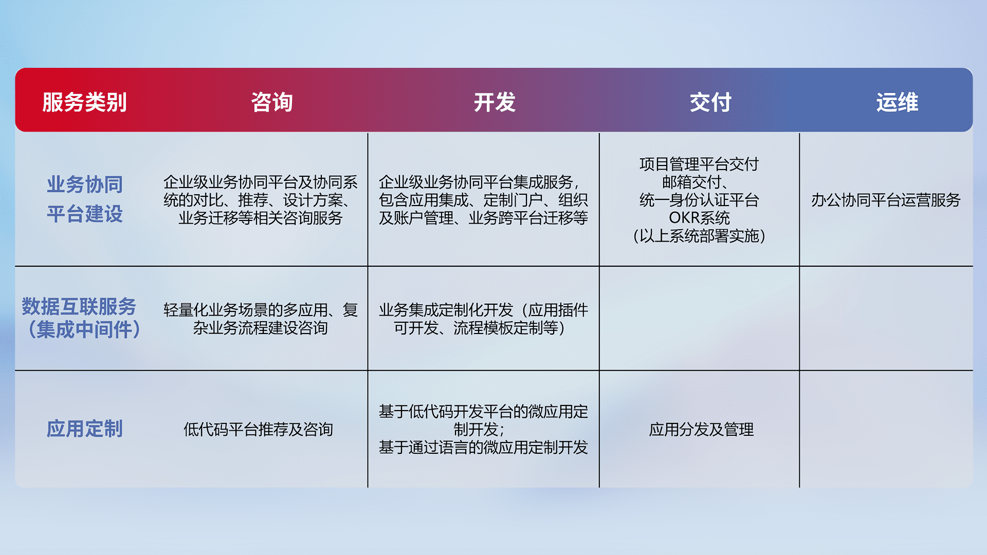 针对钉钉、、、企微、、、、IDaas等平台级产品提供产品的规划、、、、方案、、、、交付、、、、定制化开发等服务,,,,实现如统一协同办公、、、智能客户服务、、、混合会议管理、、、、智能数据查询、、、等业务场景,,实现数字化转型。。。。